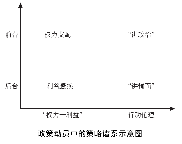 文章以笔者2015 年以来对 H 省江县。农地确权政策执行的追踪调查为基础,呈现在特定资源结构和关系结构下的乡镇政权如何对村干部进行有效激励和动员。文章通过对乡镇动员过程中各方行动者的分析,展现了乡镇在动员村庄过程中的多重逻辑,即前者一方面通过权力支配和利益置换相结合形成“权力—利益之网”使村干部与其保持一致,另一方面又通过“讲政治”与“讲情面”的方式,运用政治伦理和社会伦理相结合所勾连起的“公—私伦理之网”来约束村干部的行为。其中权力支配机制是乡镇干部依凭科层制所赋予的正式权力对村干部进行动员,它代表着一种正式的组织权威,强调以事本主义、程序性的方式来处理问题、执行政策。“讲政治”机制的核心是乡镇党委将落实政策上升为“中心工作”后,用非常规、打破科层结构束缚的方式整合资源,克服既有制度限制与资源匮乏的局限,从事本主义上升到“党性”等组织原则层面来推进政策的执行。如下图所示,由于权力支配机制和“讲政治”的机制与行政体制和政治体制相契合,因而其更多地适用于前台,在公开场合实践。